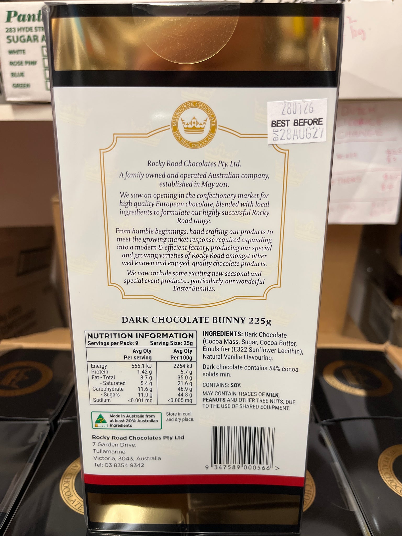 Made in Australia from fine Belgian dark chocolate by Rocky Road Chocolate Co. 225g