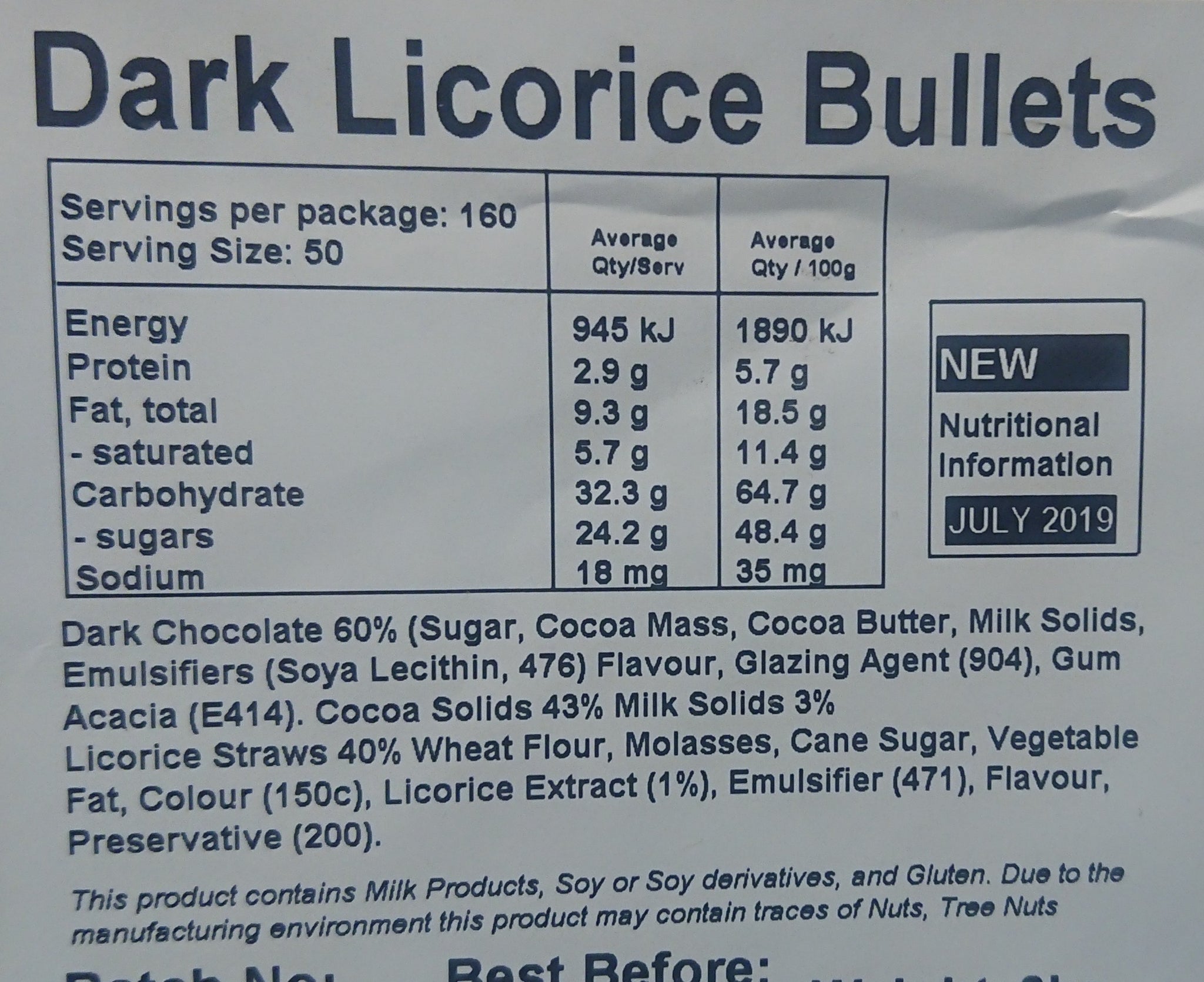 Dark chocolate 60%, sugar, cocoa mass, cocoa butter, milk solids, emulsifiers (soya lecethin, 47i6), flavours, glazing agents (vegetable gum E415, 904), contains cocoa solids 43% milk solids 3%, licorice straws 40% wheat flour, molasses, sugar, vegetable oil, licorice extract (1.5%), starch, emulsifier (471), natural flavour, preservative (100). This product contains mik, soy, wheat, gluten. Due to the manufacturing environment this product may contain traces of peanuts, almonds, macadamias, cashews, hazelnuts.