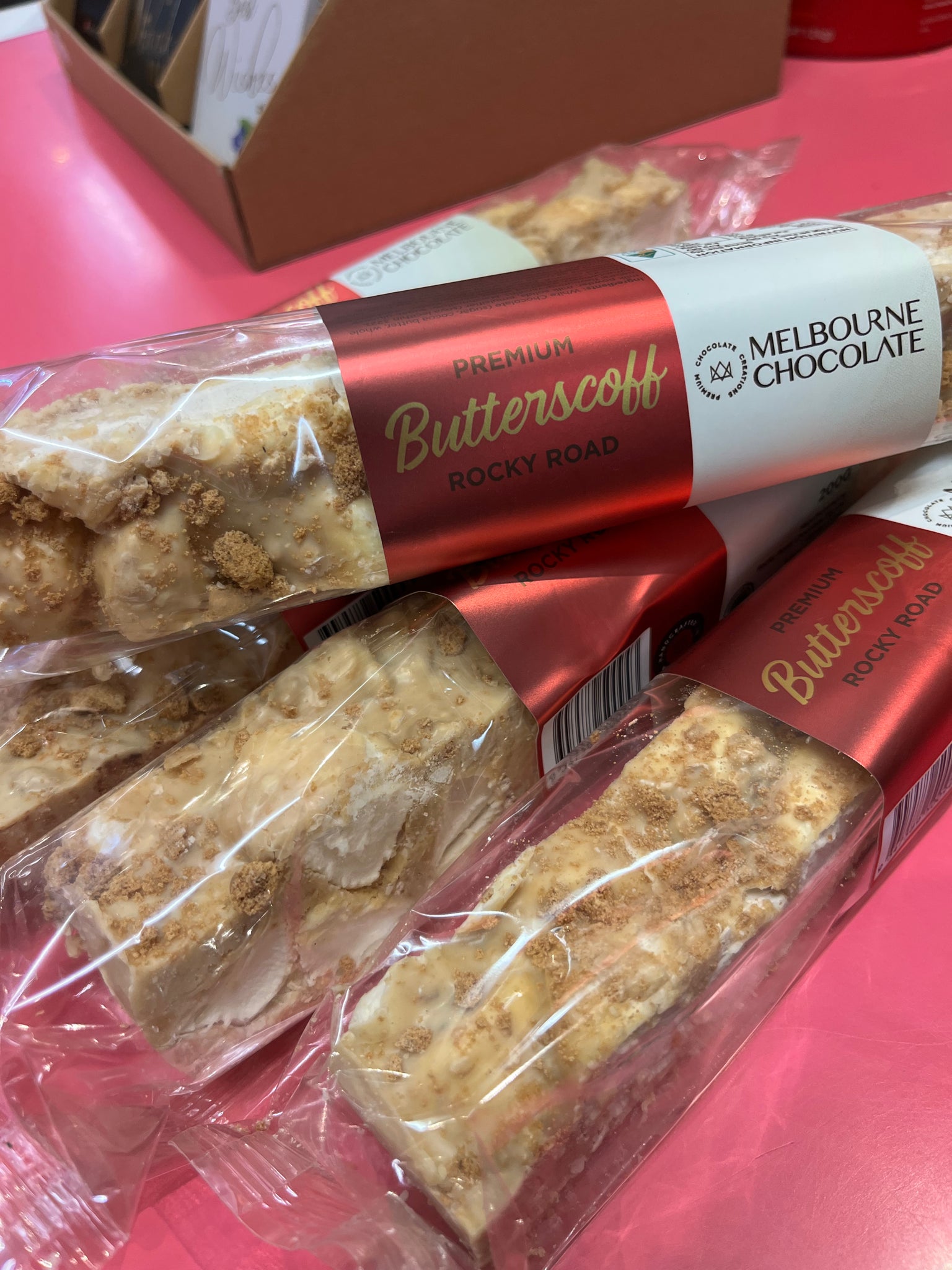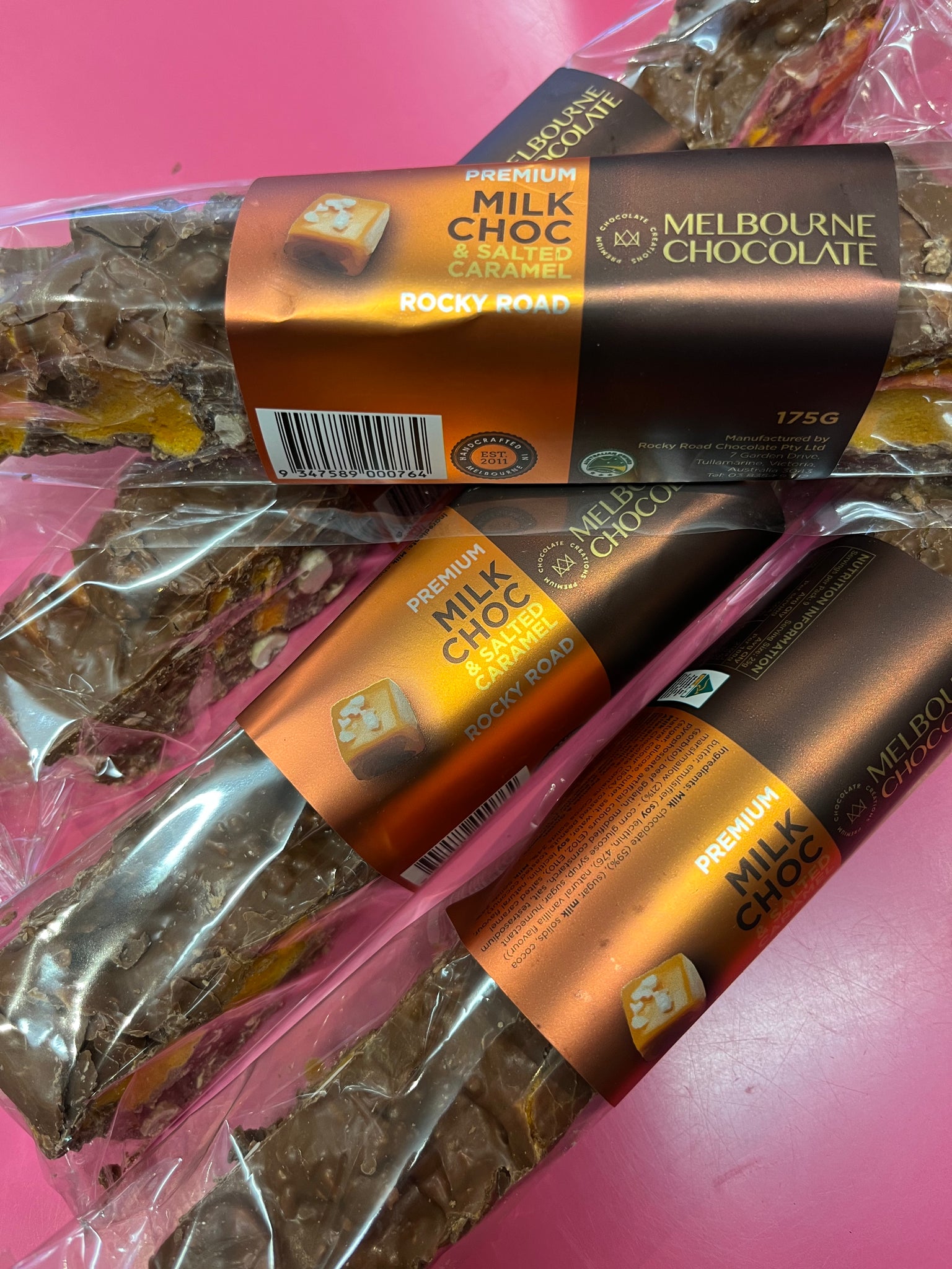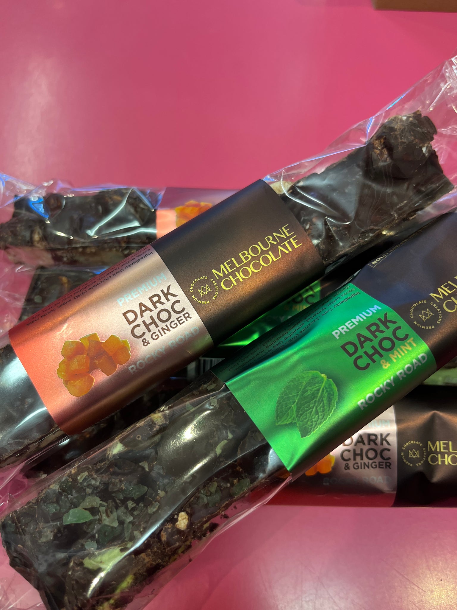 Rocky Road - white, milk or dark also Butterscoff , dark ginger, dark mint, milk chocolate salted caramel $14.90 #chocolate #shoplocal
