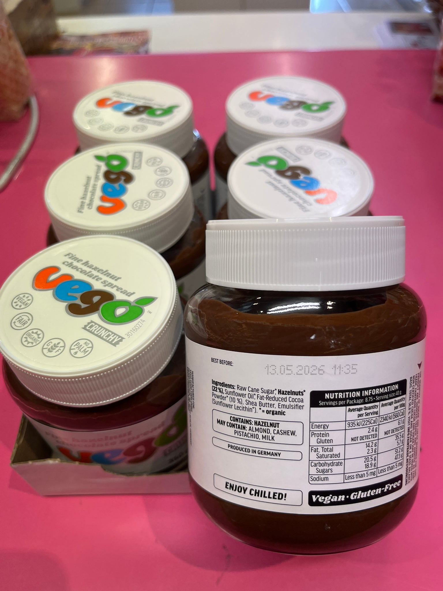 BIGGER SIZE Vego crunchy and organic fine hazelnut chocolate spread that is Vegan and Gluten Free.